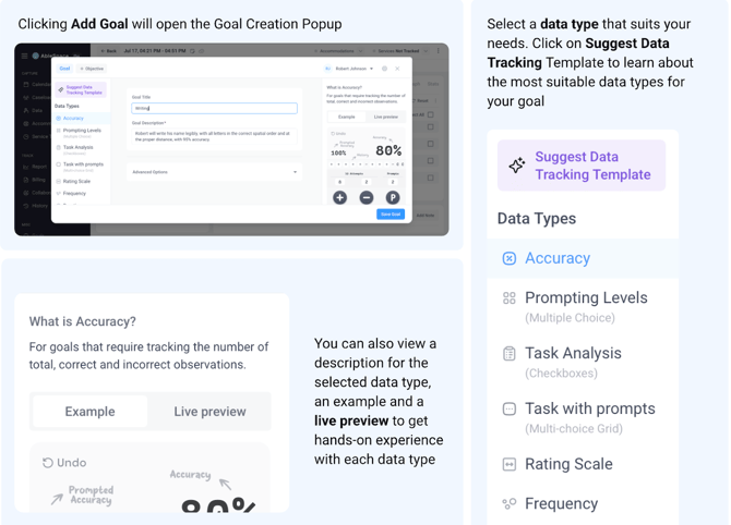 - Left Panel: Select one of the 11 different data types. These determine how data will be collected for the goal.