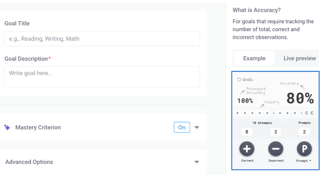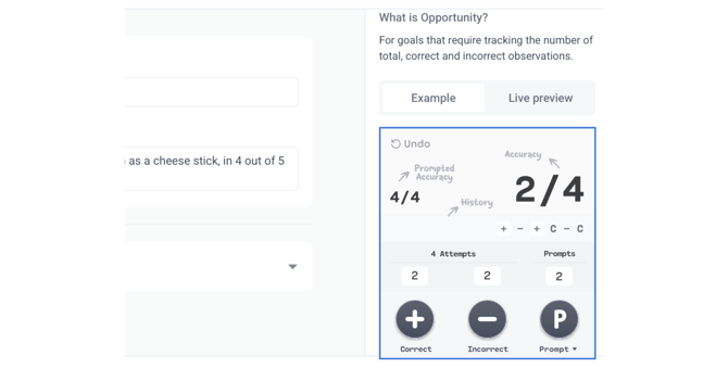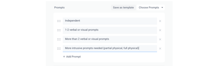 Track how much assistance the student needs. Set up custom prompt levels and select one during data collection.