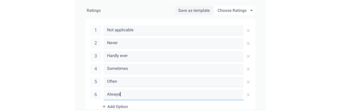 Measure progress using a scale. Add or delete options as you need. You can also assign customized labels and values (e.g., 1–5 or "Emerging" to "Mastered").
