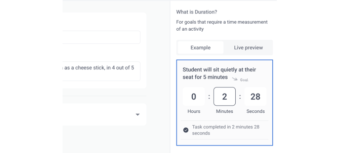 Track how long a behavior or activity lasts. This data type is suitable for goals that require a time measurement of an activity.