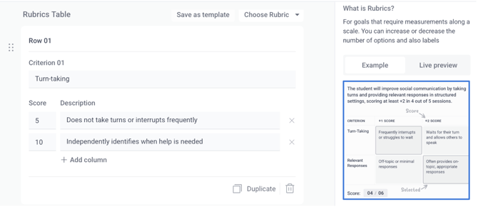 This data type is suitable for tracking progress across a defined scale, like rating student skills or behaviour. Simply enter the criteria you wish to rate and set up the columns that define the scoring scale.