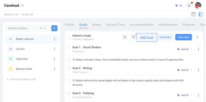 Note: If you have a spreadsheet or IEP management system containing a large list of students and associated goals, the Add Multiple Goals option enables you to manually import them into your caseload efficiently.