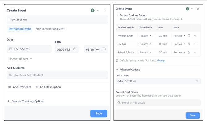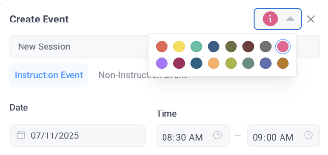 - Event Type: Select either Instruction or Non-Instruction (Non-instructional events, like lunch breaks, do not support data tracking.)
