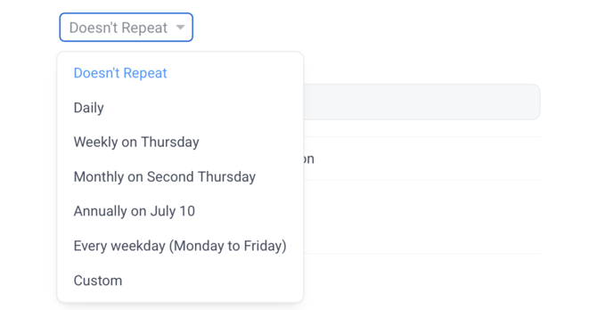 - Click the "Doesn't repeat" dropdown and choose a recurring frequency (e.g., daily, weekly).