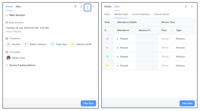 - Navigate to the Data section of the sidebar to log data such as Service Time, Accommodations, and Session Notes.