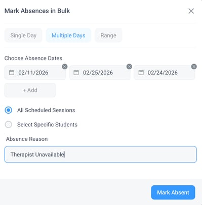 - You can also mark all sessions on a selected day as absent. (When this option is clicked, it opens a modal that allows you to choose a day, multiple spread-out days, or a range of days to mark as absent. You can choose how to handle sessions in the selected range and mention the absence reason.)