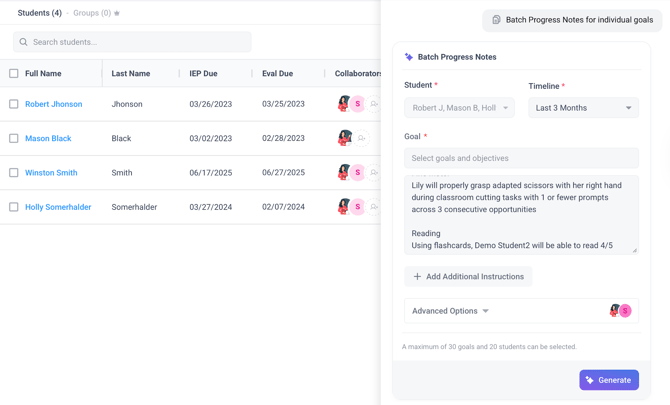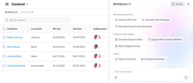 AbleSpace is designed to automate your special education workflows. Its AI-powered tools allow you to generate IEP goals, goal strategies, progress notes, batch notes, worksheets, and more.