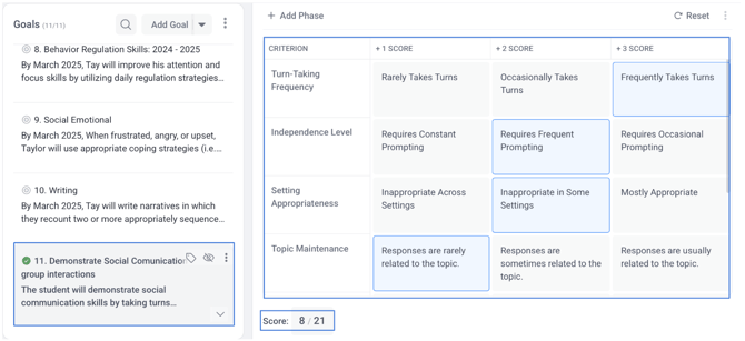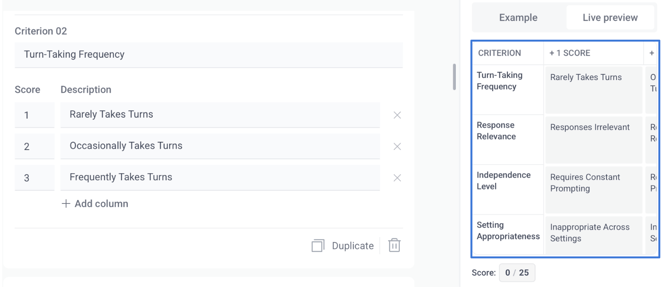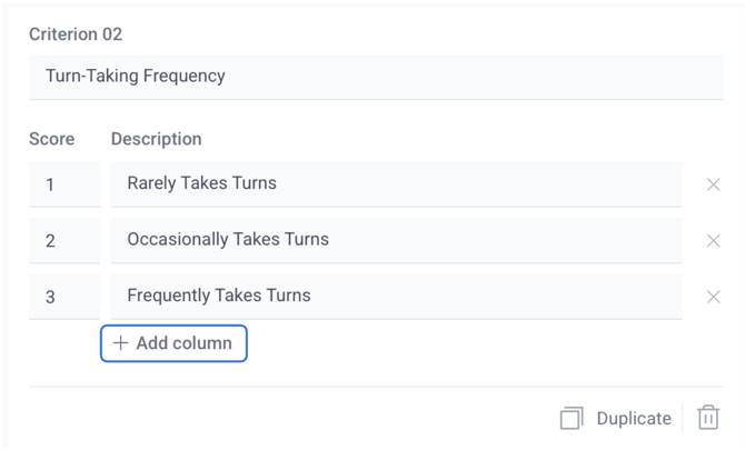 - Set Up Scoring Scale (Columns): Next, set up your columns to define the scoring scale. For example, a score of five could be for a student who "does not take turns or interrupts frequently," while a score of 10 could be for a student who "independently identifies when help is needed".