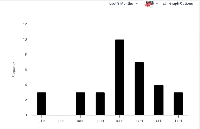 Click the dropdown menu to group data by time frame. Select from Trials, Sessions, Days, Weeks, or Months. Click “Aggregate by” to group sessions, days, weeks, or months, but only for number-type measurement fields such as frequency, duration, or custom values.